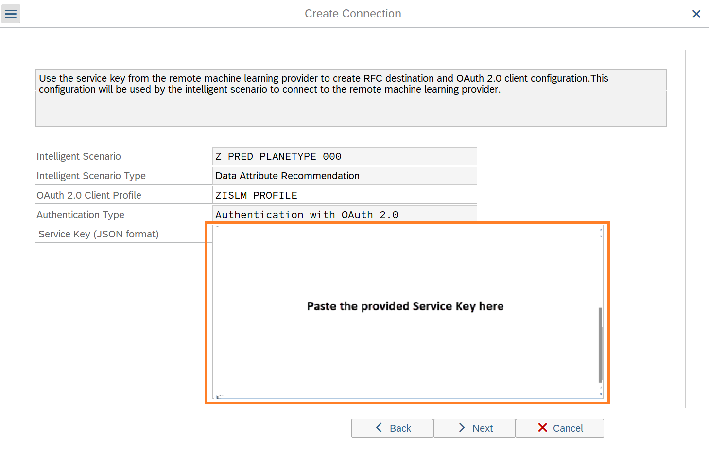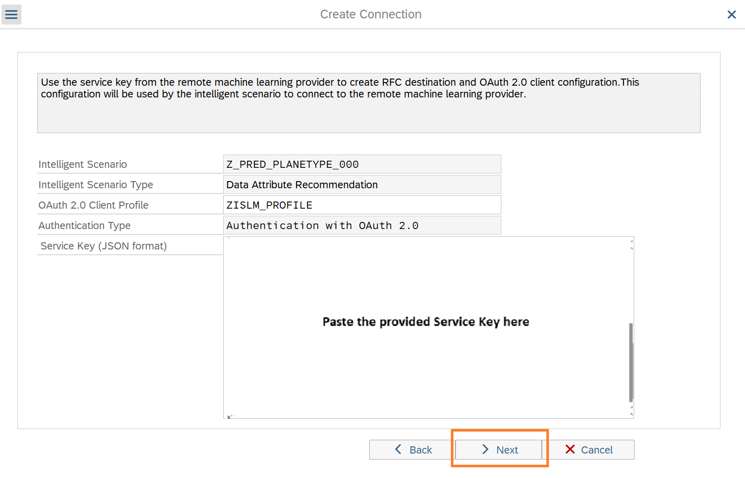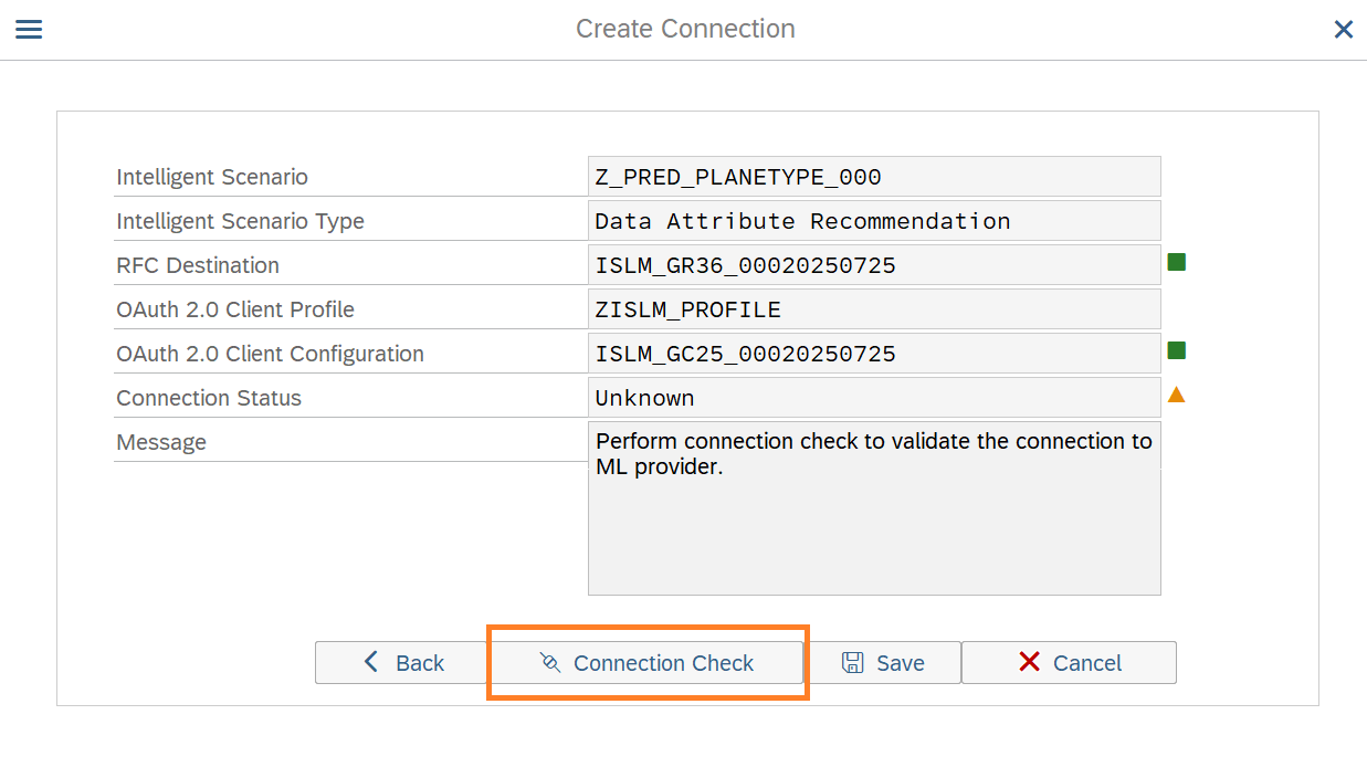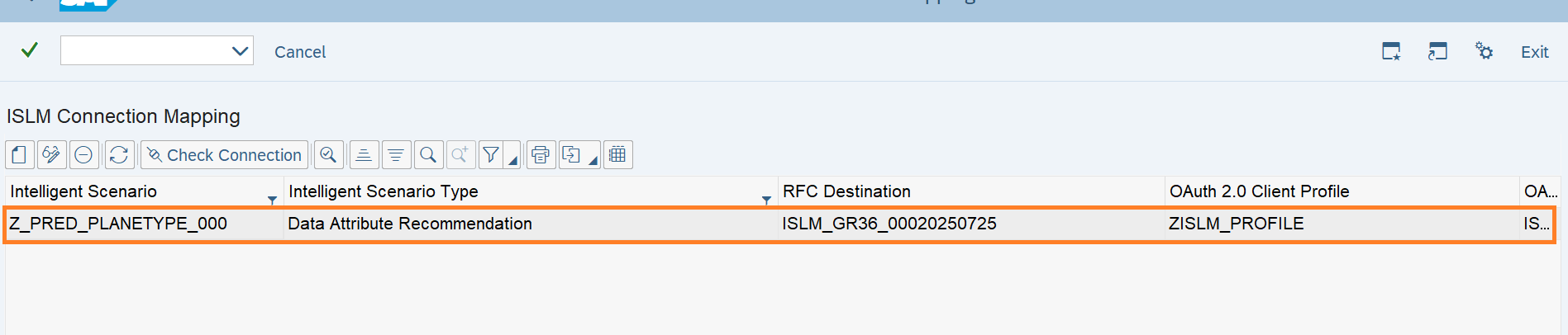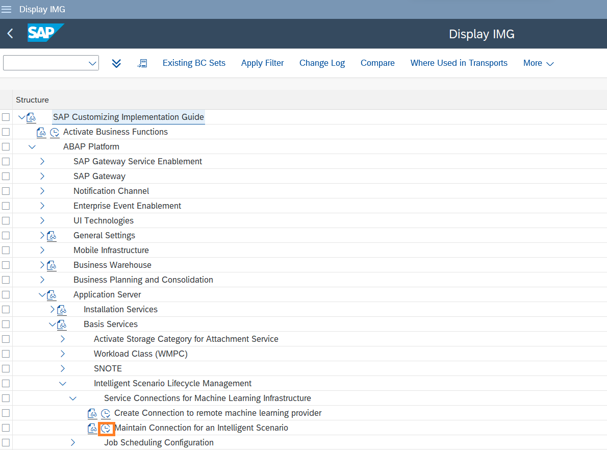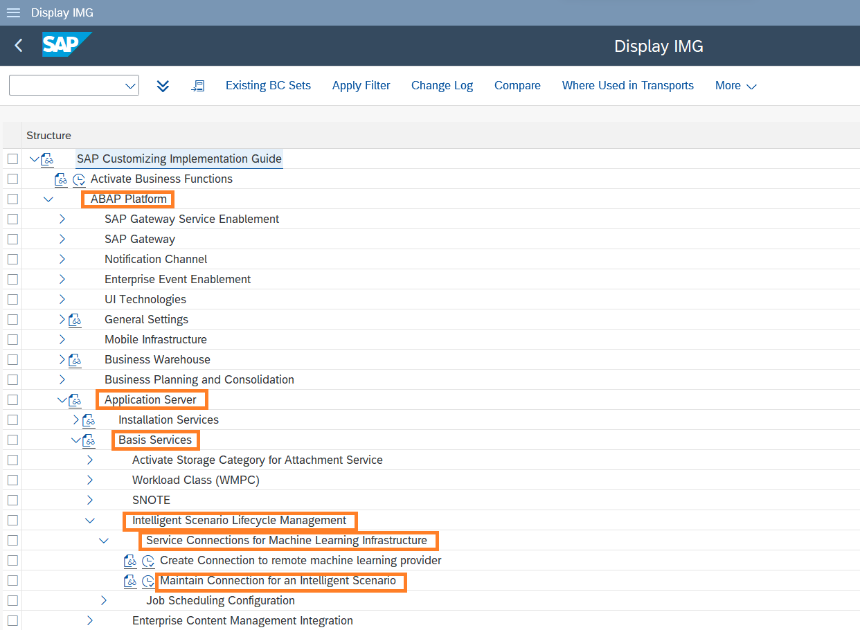 Navigate to ABAP Platform >Application Server >Basis Services >Intelligent Scenario Lifecycle Management> Service Connections for Machine Learning Infrastructure > Maintain Connection for an Intelligent Scenario.