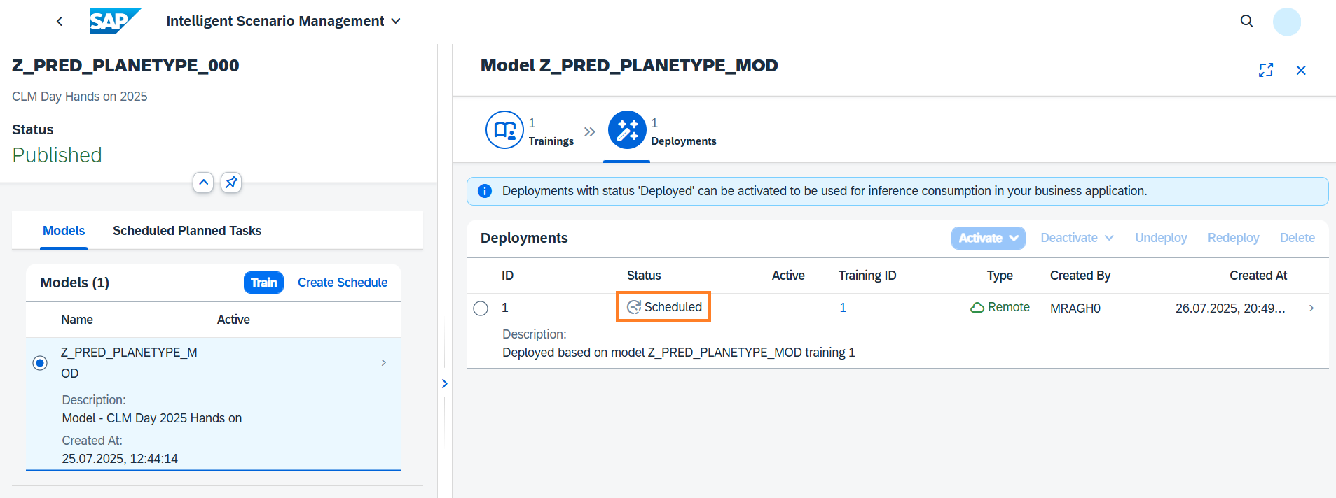 A new Deployment is created in Scheduled status.