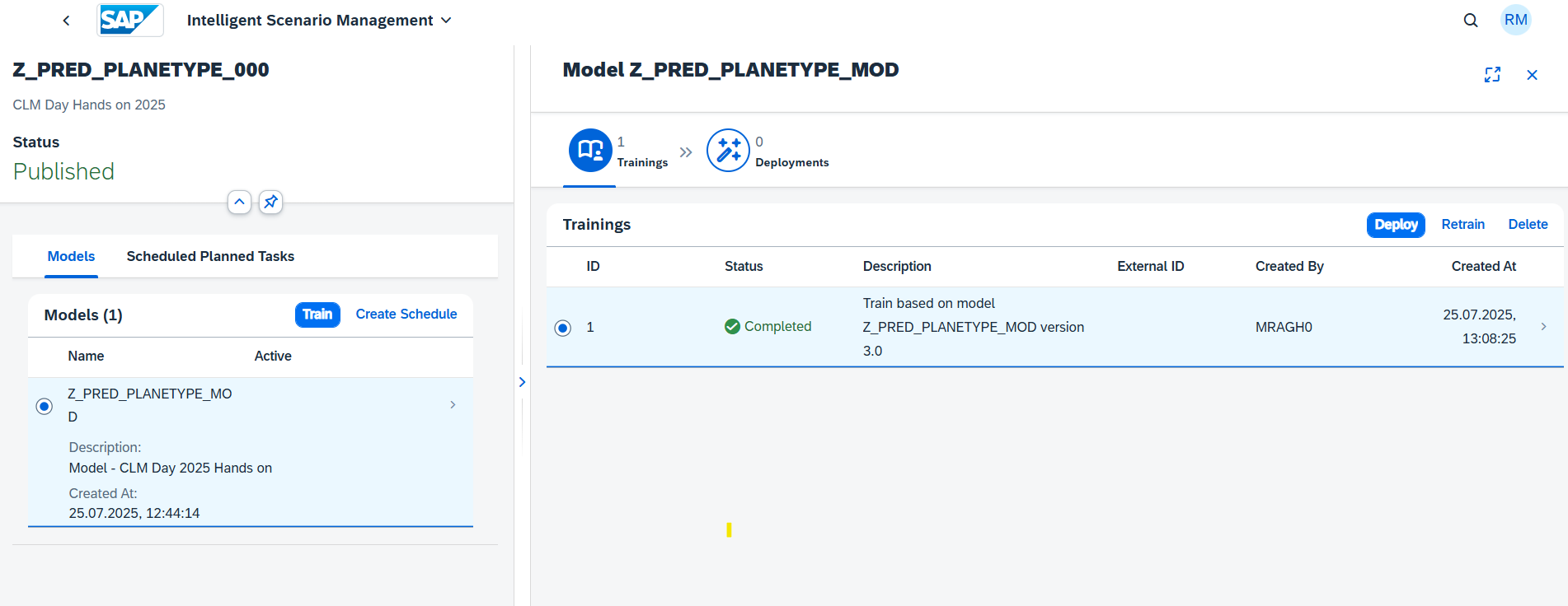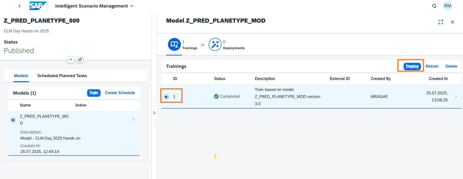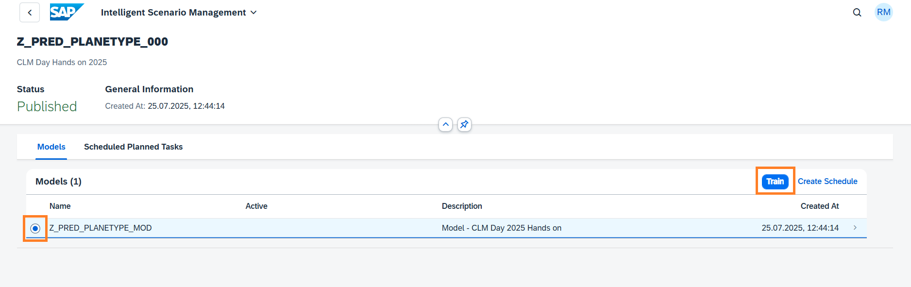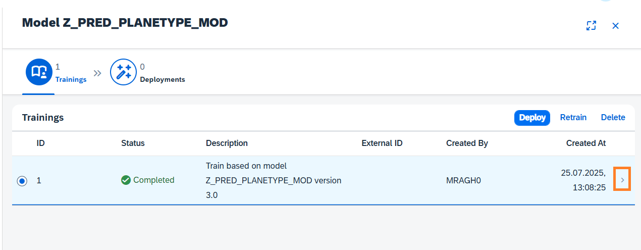 Once the Intelligent Scenario is published, the Intelligent Scenario Management app helps you to train, monitor the model quality, deploy, and activate the model for productive usage. In this section, you will use the Intelligent Scenario Management app to perform ML operations.