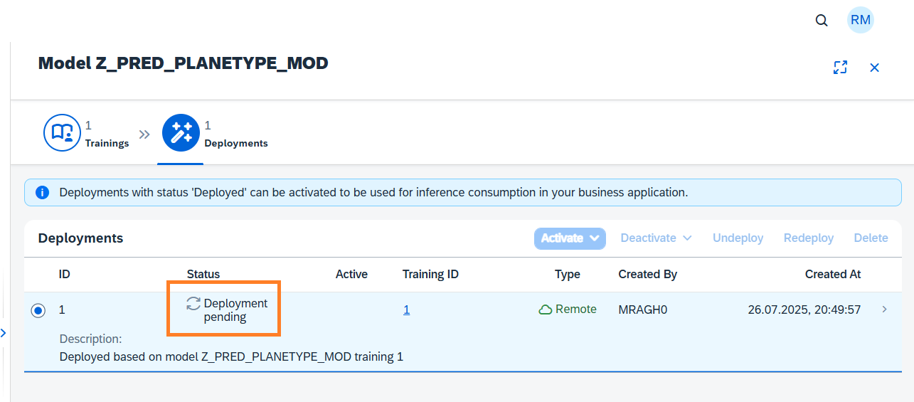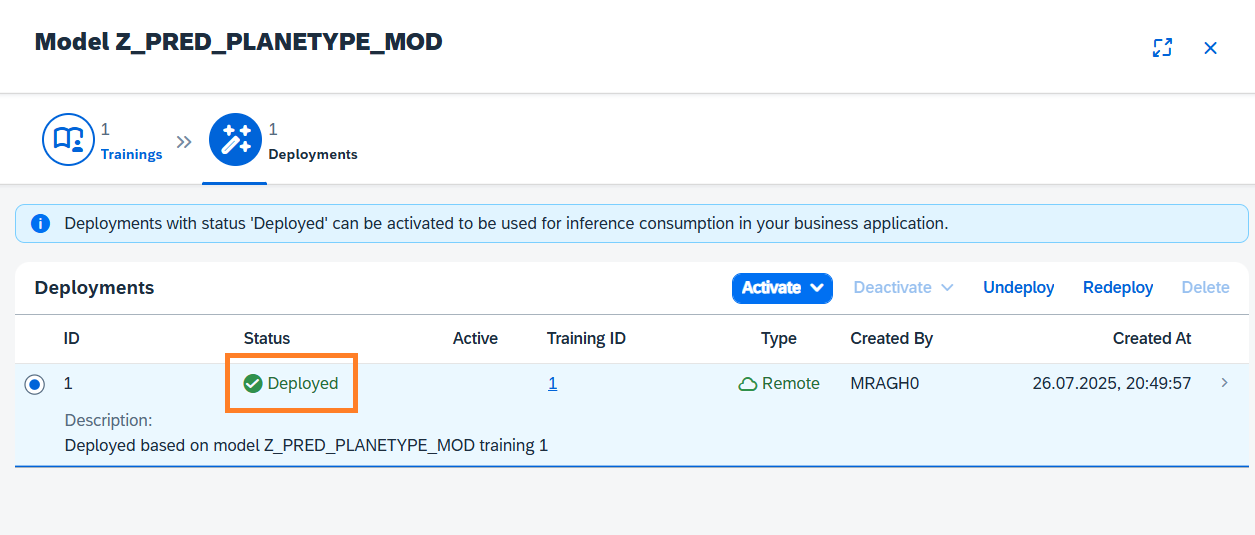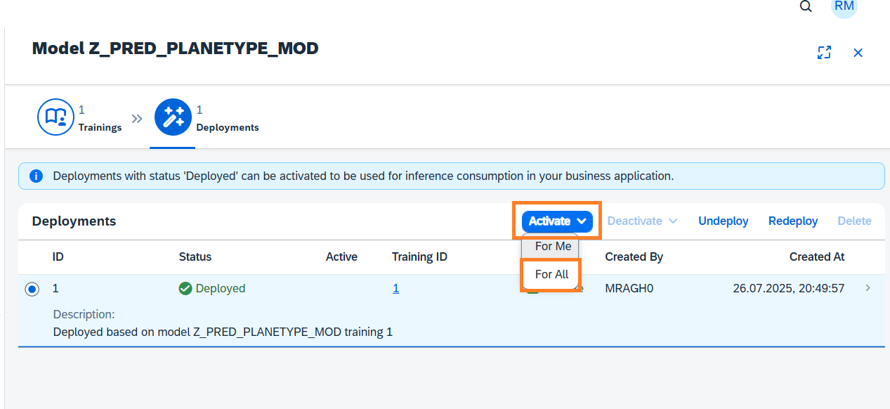 To consume the resulting inference from this intelligent scenario the deployment must be activated. Select the Deployment and click the Activate button and choose For All option.