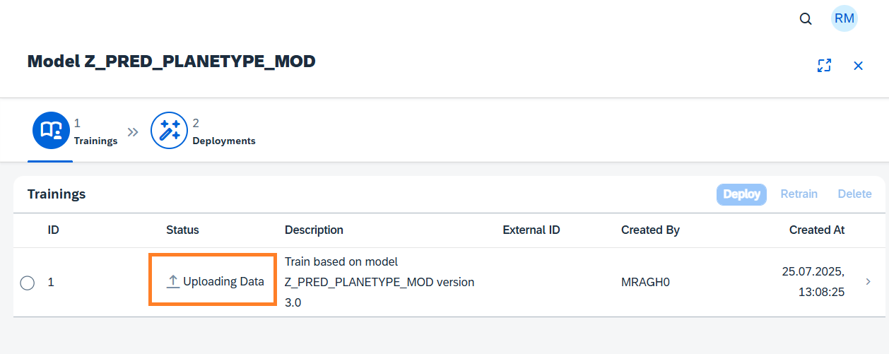 Monitor the status of Training and check that the status changes to Uploading Data.