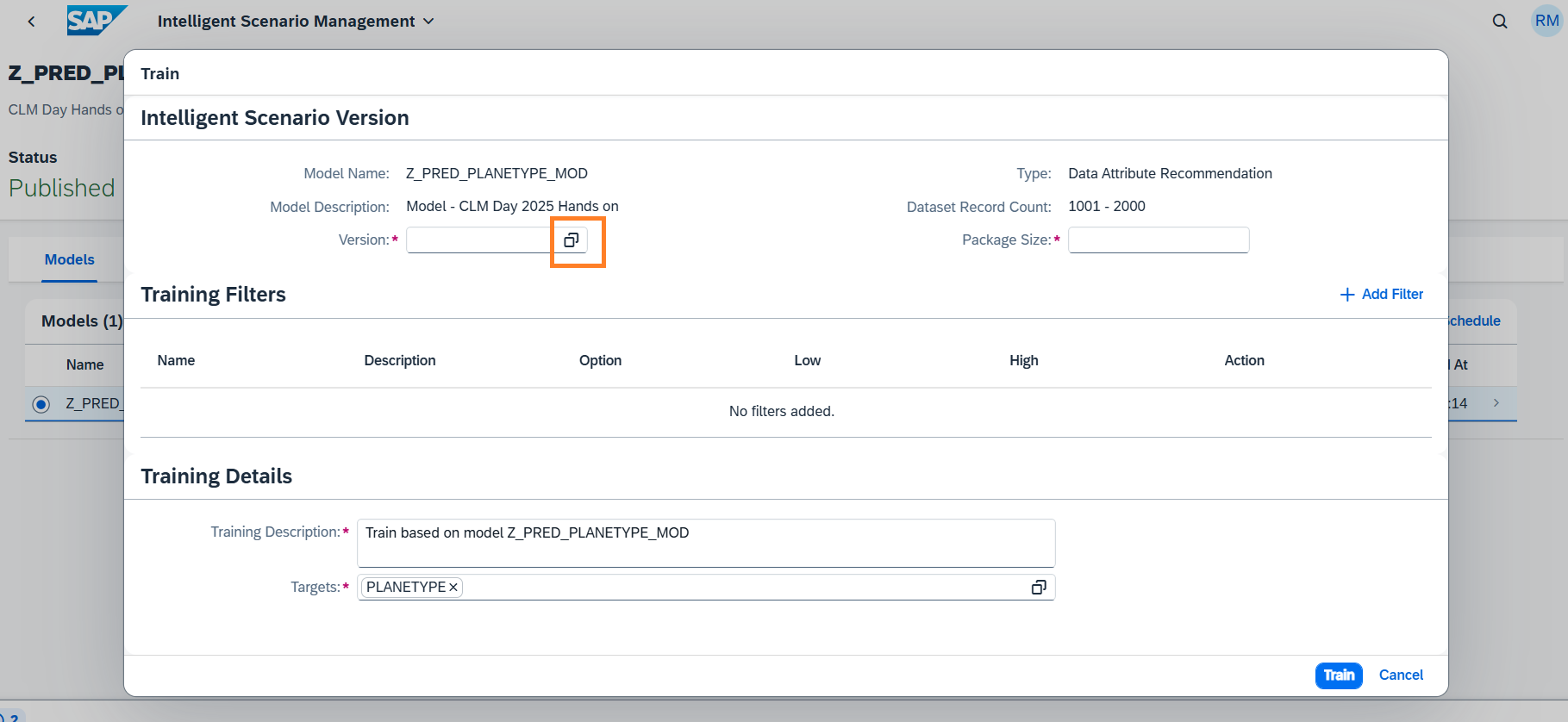 In train dialog, select a Version from the remote machine learning provider by clicking the highlighted value help.