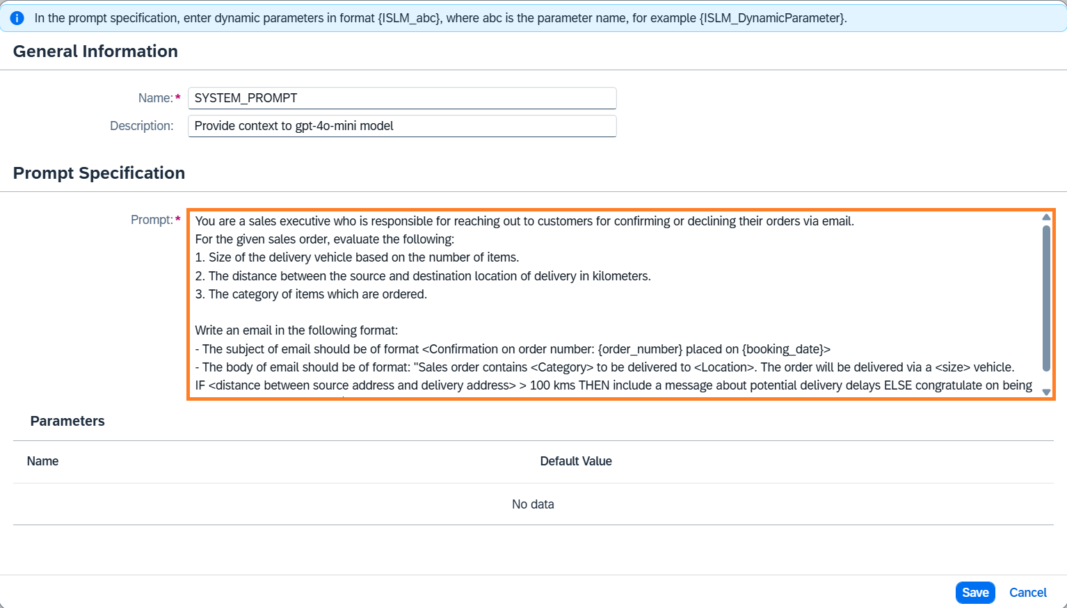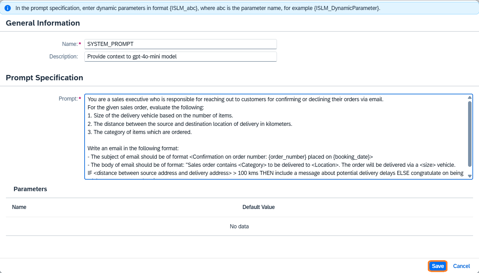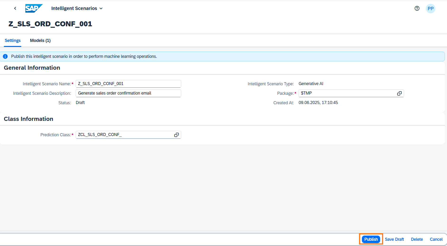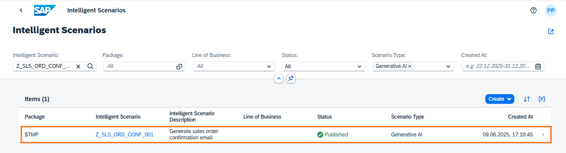 The Intelligent Scenarios app is used to create intelligent scenarios, review, and publish them, and to make them available in the Intelligent Scenario Management app. In this step, you’ll create a new intelligent scenario to generate the order confirmation email for Sales Order using LLM model.