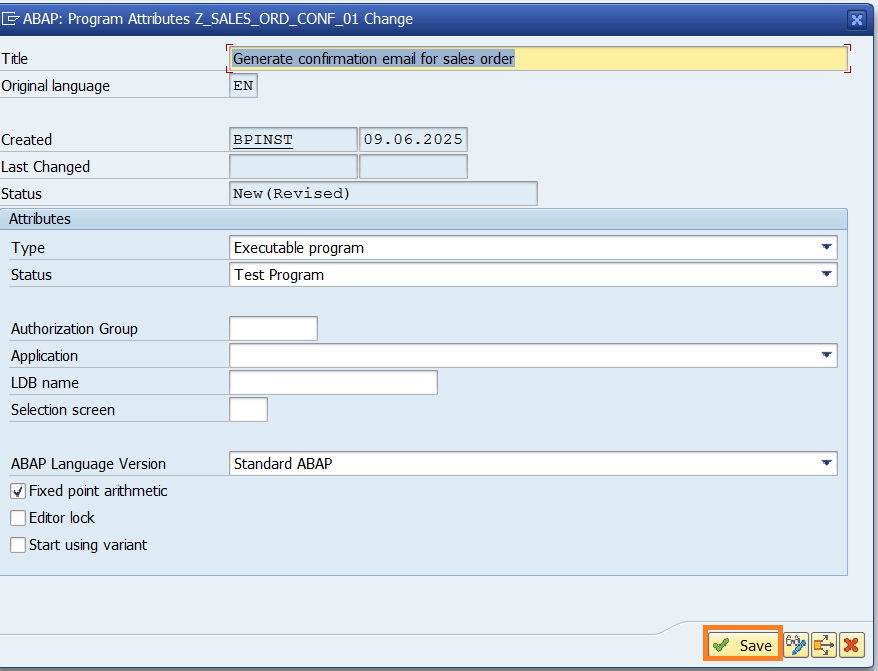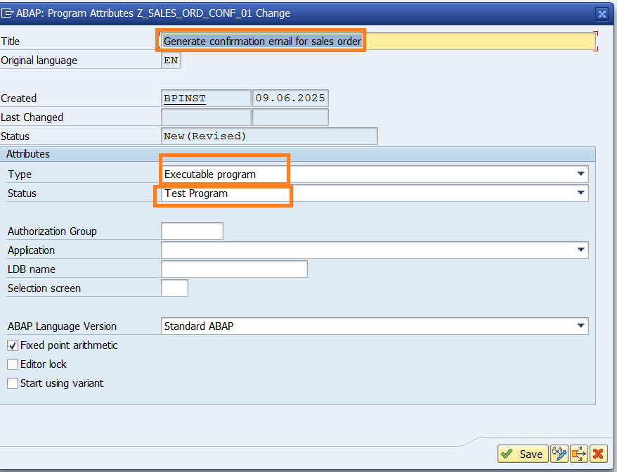 Generate confirmation email for sales order- Select the Type asExecutable program. - Change the Status toTest program.