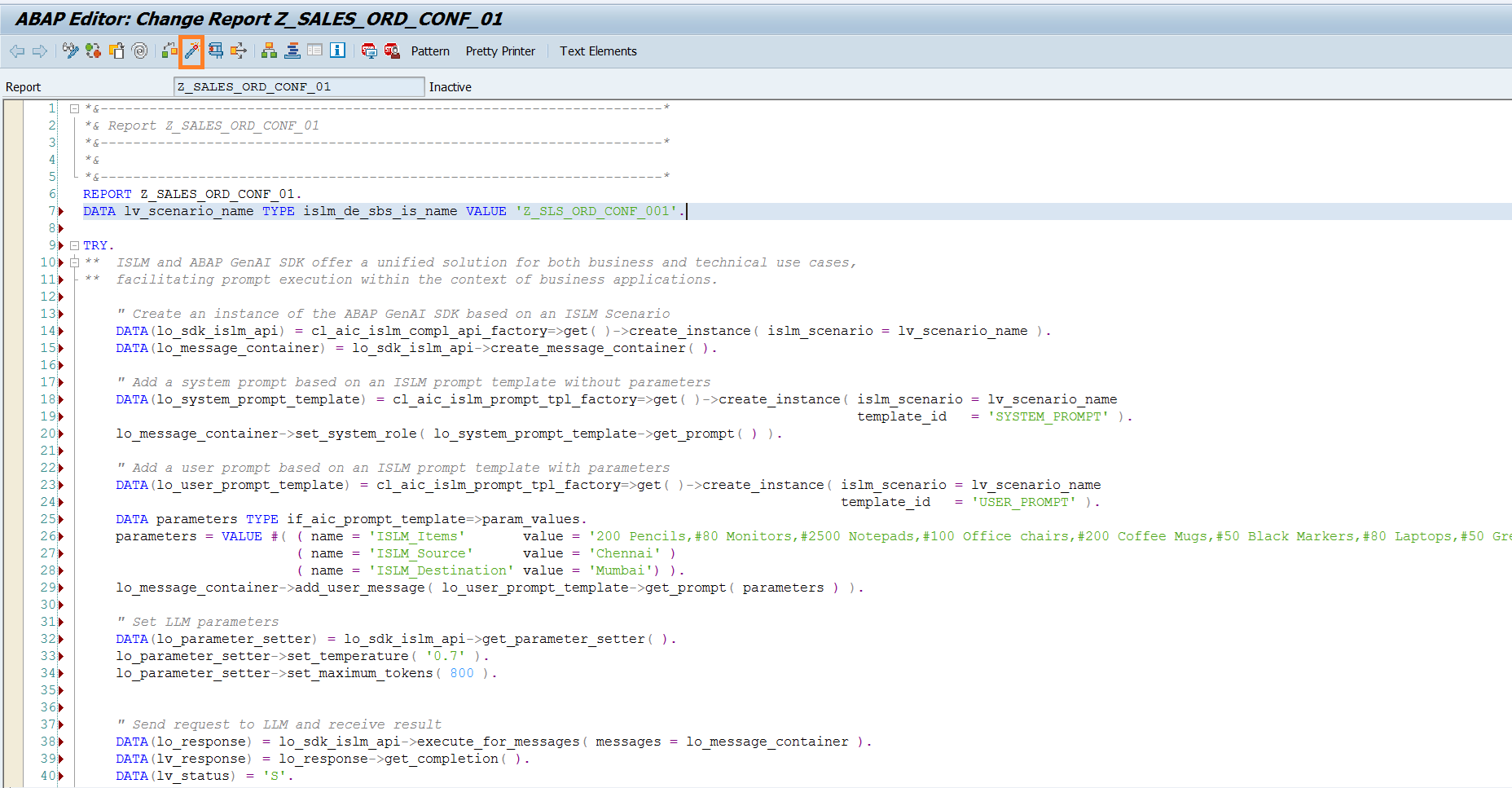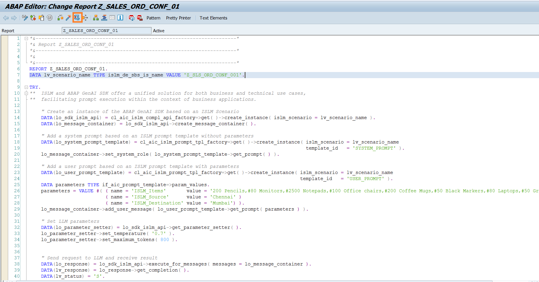DATA lv_scenario_name TYPE islm_de_sbs_is_name VALUE 'Z_SLS_ORD_CONF_###'. TRY. ** ISLM and ABAP GenAI SDK offer a unified solution for both business and technical use cases, ** facilitating prompt execution within the context of business applications. " Create an instance of the ABAP GenAI SDK based on an ISLM Scenario DATA(lo_sdk_islm_api) = cl_aic_islm_compl_api_factory=>get( )->create_instance( islm_scenario = lv_scenario_name ). DATA(lo_message_container) = lo_sdk_islm_api->create_message_container( ). " Add a system prompt based on an ISLM prompt template without parameters DATA(lo_system_prompt_template) = cl_aic_islm_prompt_tpl_factory=>get( )->create_instance( islm_scenario = lv_scenario_name template_id = 'SYSTEM_PROMPT' ). lo_message_container->set_system_role( lo_system_prompt_template->get_prompt( ) ). " Add a user prompt based on an ISLM prompt template with parameters DATA(lo_user_prompt_template) = cl_aic_islm_prompt_tpl_factory=>get( )->create_instance( islm_scenario = lv_scenario_name template_id = 'USER_PROMPT' ). DATA parameters TYPE if_aic_prompt_template=>param_values. parameters = VALUE #( ( name = 'ISLM_Items' value = '200 Pencils,#80 Monitors,#2500 Notepads,#100 Office chairs,#200 Coffee Mugs,#50 Black Markers,#80 Laptops,#50 Green Markers') ( name = 'ISLM_Source' value = 'Chennai' ) ( name = 'ISLM_Destination' value = 'Mumbai') ). lo_message_container->add_user_message( lo_user_prompt_template->get_prompt( parameters ) ). " Set LLM parameters DATA(lo_parameter_setter) = lo_sdk_islm_api->get_parameter_setter( ). lo_parameter_setter->set_temperature( '0.7' ). lo_parameter_setter->set_maximum_tokens( 800 ). " Send request to LLM and receive result DATA(lo_response) = lo_sdk_islm_api->execute_for_messages( messages = lo_message_container ). DATA(lv_response) = lo_response->get_completion( ). DATA(lv_status) = 'S'. CATCH cx_aic_api_factory INTO DATA(lx_factory). lv_response = lx_factory->get_text( ). lv_status = 'E'. CATCH cx_aic_completion_api INTO DATA(lx_completion). lv_response = lx_completion->get_text( ). lv_status = 'E'. CATCH cx_aic_prompt_template INTO DATA(lx_prompt_template). lv_response = lx_prompt_template->get_text( ). lv_status = 'E'. ENDTRY. " Display the sales report generated by gpt-4o-mini model cl_demo_output=>display_text( text = lv_response ). -