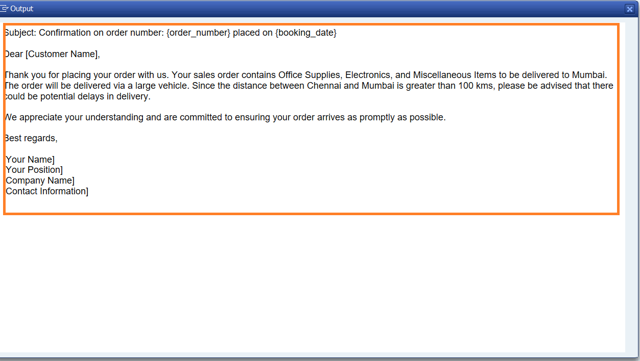 Well done, you have successfully queried the gpt-4o-mini model to generate the confirmation email for sales order.
