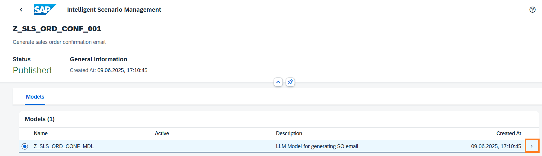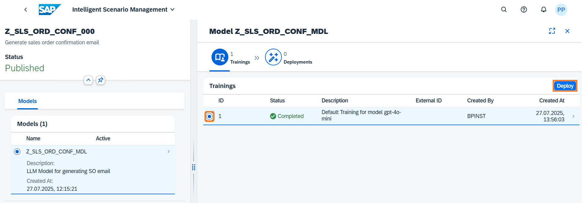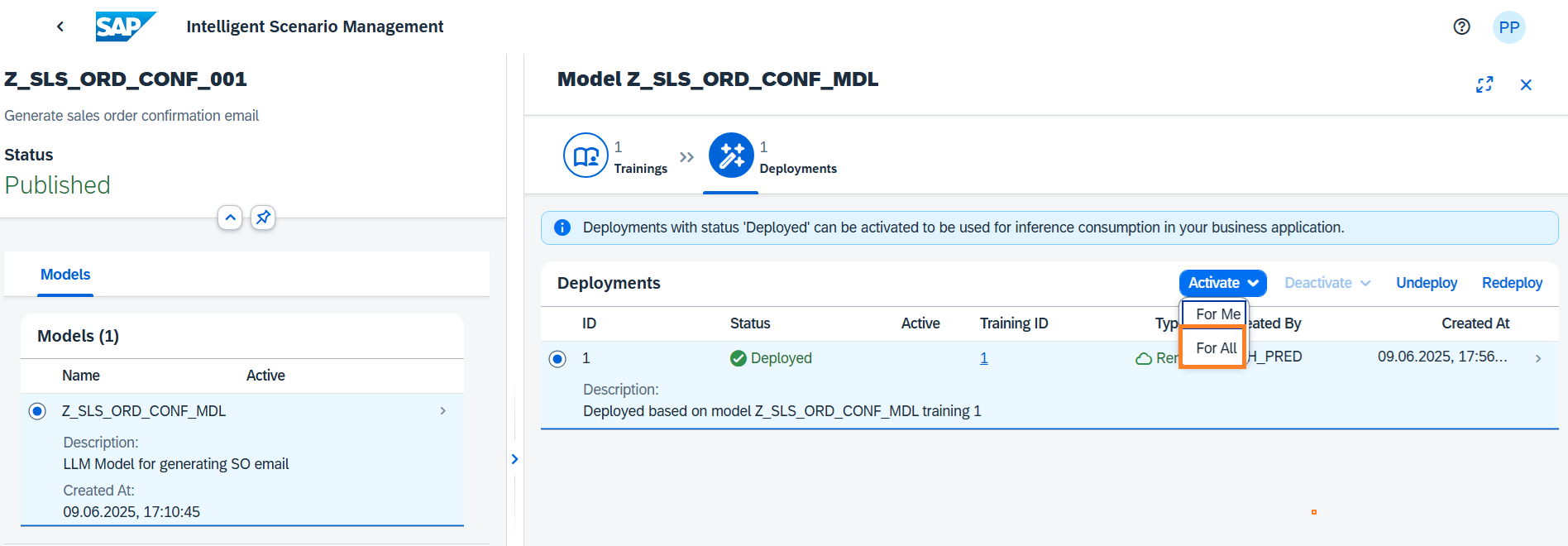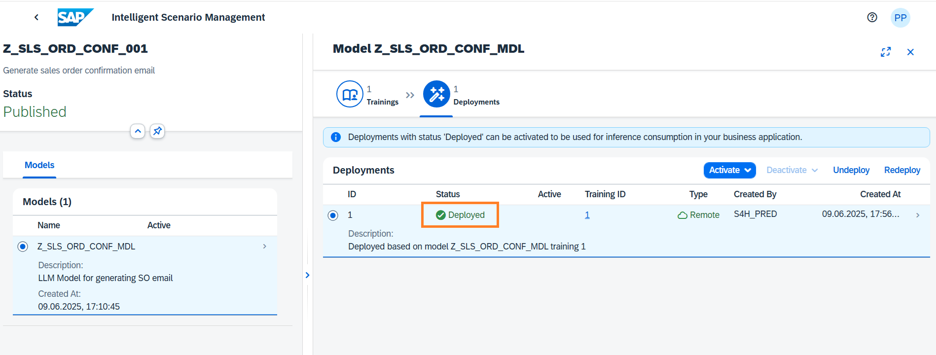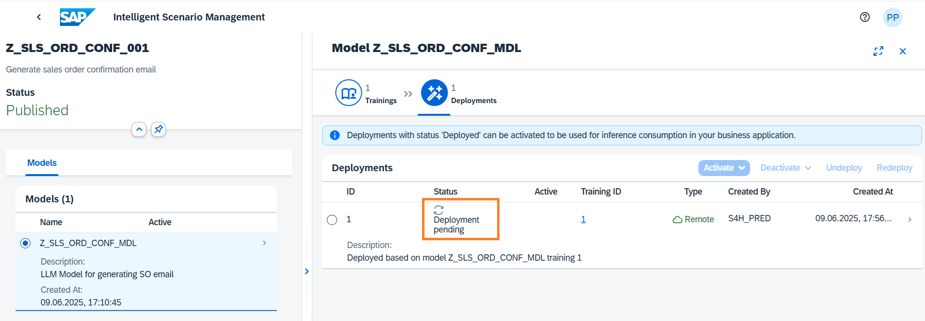 Once the Intelligent Scenario is published, the Intelligent Scenario Management app helps you to deploy and activate the model for productive usage. In this section, you will use the Intelligent Scenario Management app to perform operations on your Intelligent Scenario.