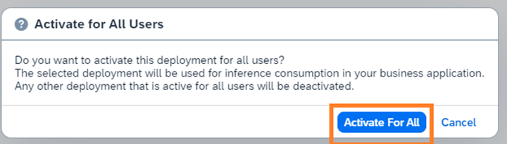 - Activate the deployment to run inference. Select the Deployment and click on Activate button and choose For All option.